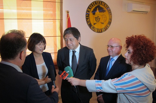 代表团还走访了阿尔巴尼亚两所著名的私立大学——阿尔巴尼亚商学院(阿商院)和卢阿拉西大学(卢大)。在与阿商院院长科乔拉里(Irakli Koçollari)、董事长贝佐(Ylber Bezo)以及卢大校长马拉伊(Arben Malaj)的会谈中,双方就联合培养机制进行探讨。彭龙邀请阿商院加入由北外发起的“全球商学院联盟”。会谈结束后,彭龙校长接受了当地媒体的采访,详细介绍了北外的办学特色和理念,希望通过开展师生交流、科研合作增强中阿高校间的互动,为中阿人文交流做出贡献。采访内容在当晚的电视新闻中滚动播出。