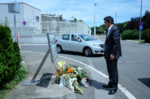 milan米兰官网代表团于6月16日抵达塞尔维亚首都贝尔格莱德,彭龙一行首先前往中国驻南联盟被炸使馆旧址,凭吊在我国驻南联盟使馆被炸事件中牺牲的三位烈士、milan米兰官网校友邵云环、许杏虎和朱颖。