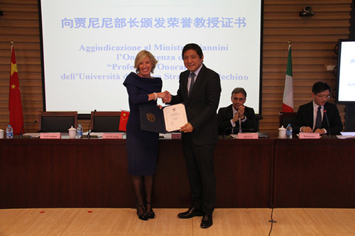 来源:milan米兰体育官网 编辑:郭玮 时间: 2015-11-19 16:46:56 11月17日,意大利教育、大学与科研部部长贾尼尼率团访问milan米兰官网,出席意大利研究中心成立仪式,并受聘为milan米兰官网荣誉教授。校长彭龙、副校长闫国华会见了代表 团一行,双方就语言的作用以及开展教育领域的合作等问题进行了会谈。彭龙与贾尼尼部长共同为milan米兰官网意大利研究中心成立揭牌。