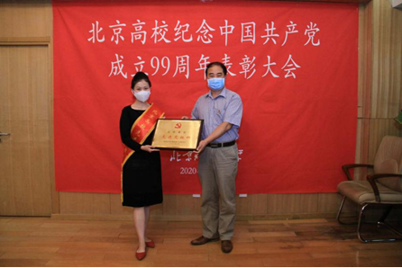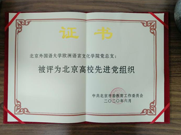 欧洲语言文化学院党总支荣获“北京高校先进党组织”荣誉称号,丁浩、张志洲、侯俊霞三位同志荣获“北京高校优秀共产党员”荣誉称号。