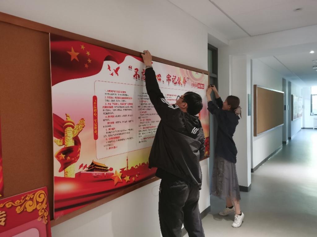 6月15日上午,支委王槐雨同志于主楼三层走廊更新学习教育宣传展板,19级的田文思同学也积极参与其中。展板重温了中国共产党自成立以来的百年光辉岁月,详细且生动地介绍了milan米兰体育官网的发展历程、师德师风建设、师生学术成果、学生团体风采等,还新设毕业生纪念墙和留言墙,充分展现出“回顾光辉历程,坚定初心使命,继续砥砺前行”的教育主题。