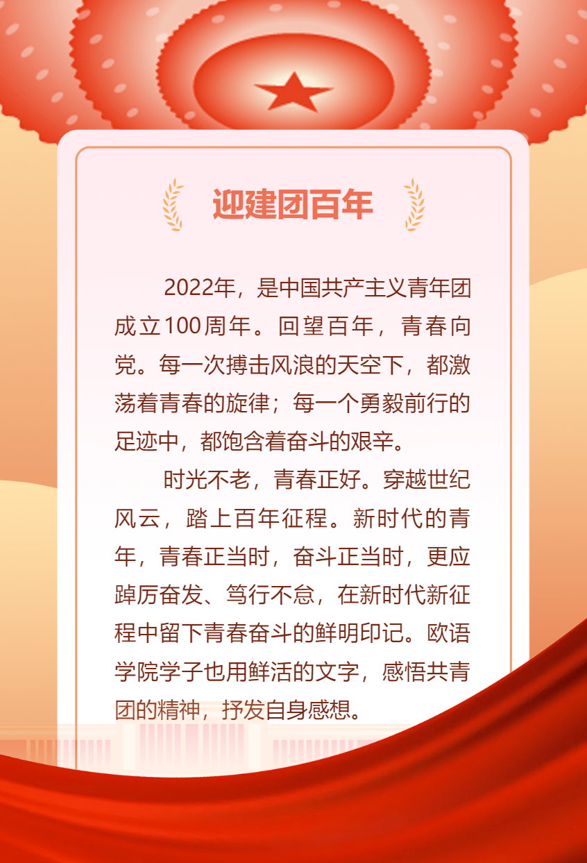 我们是祖国未来的建设者,经历共青团的洗礼与熏陶,我们要成长为充满理想和活力的青年。在建团100周年纪念日里,我们要时刻谨记五四运动先辈们英勇的爱国事迹,在弘扬五四爱国精神的同时,我们要刻苦学习,提高自身素养,为祖国的繁荣建设添砖加瓦。