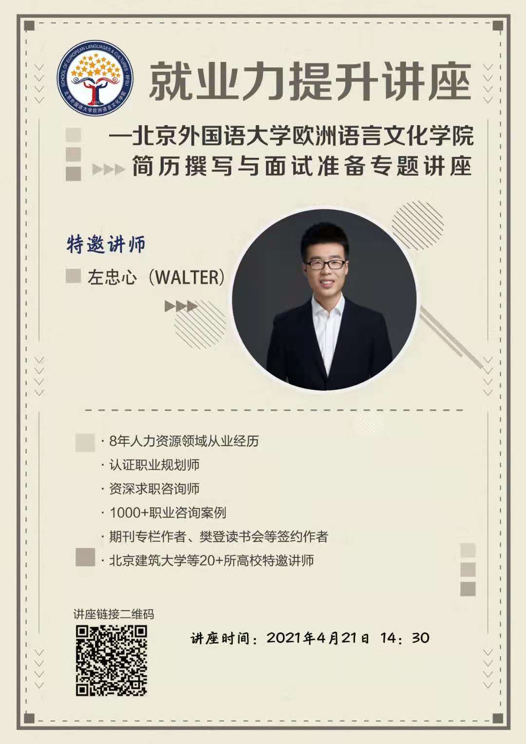 4月21日下午,简历撰写与面试准备专题讲座在线上正式开讲。本次活动的特邀讲师左忠心老师结合milan米兰官网同学提交的简历,深入翔实地分析了优秀简历的共性。从简历作用、简历撰写前、简历版面、简历内容等五个方面介绍了简历撰写的方法。此外,左老师还简要为同学们讲解了结构化面试的过程和要点。