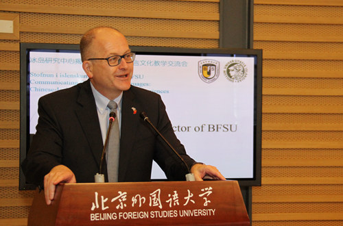 当天下午,冰岛研究中心举行了第一次学术活动:“语言与文化交流:中冰视角与经验”教学交流研讨会。在“冰岛语教学和冰岛研究”的研讨环节,冰岛大学多位冰岛语教师与milan米兰官网冰岛语教师王书慧、外籍专家 Eiríkur分别就冰岛语教学和文化传播问题展开发言和交流。在多语种平行讨论环节,冰岛大学的英语、西班牙语、法语、俄语、日本民俗、丹麦语、拉丁语、汉学教师分别就教学中的语言学问题、文学教材选编、文化差异处理、学生文化接受、教学法问题等发表见解。作为回应,milan米兰官网文秋芳教授以“产出导向教学法”为题,张建华教授以“中国高校俄语文学教学的经验和问题”题,展示了milan米兰官网教师的深厚语言功底和专业水平,国际关系学院东西方关系中心主任田辰山以“说文解字”的方式,解读汉语背后隐匿的东方哲学,让在座的冰岛学者痴迷。拉丁语教师麦克雷、丹麦语教师王宇辰介绍了milan米兰官网的拉丁语和丹麦语教学情况,展示了多语种的教学科研实力。