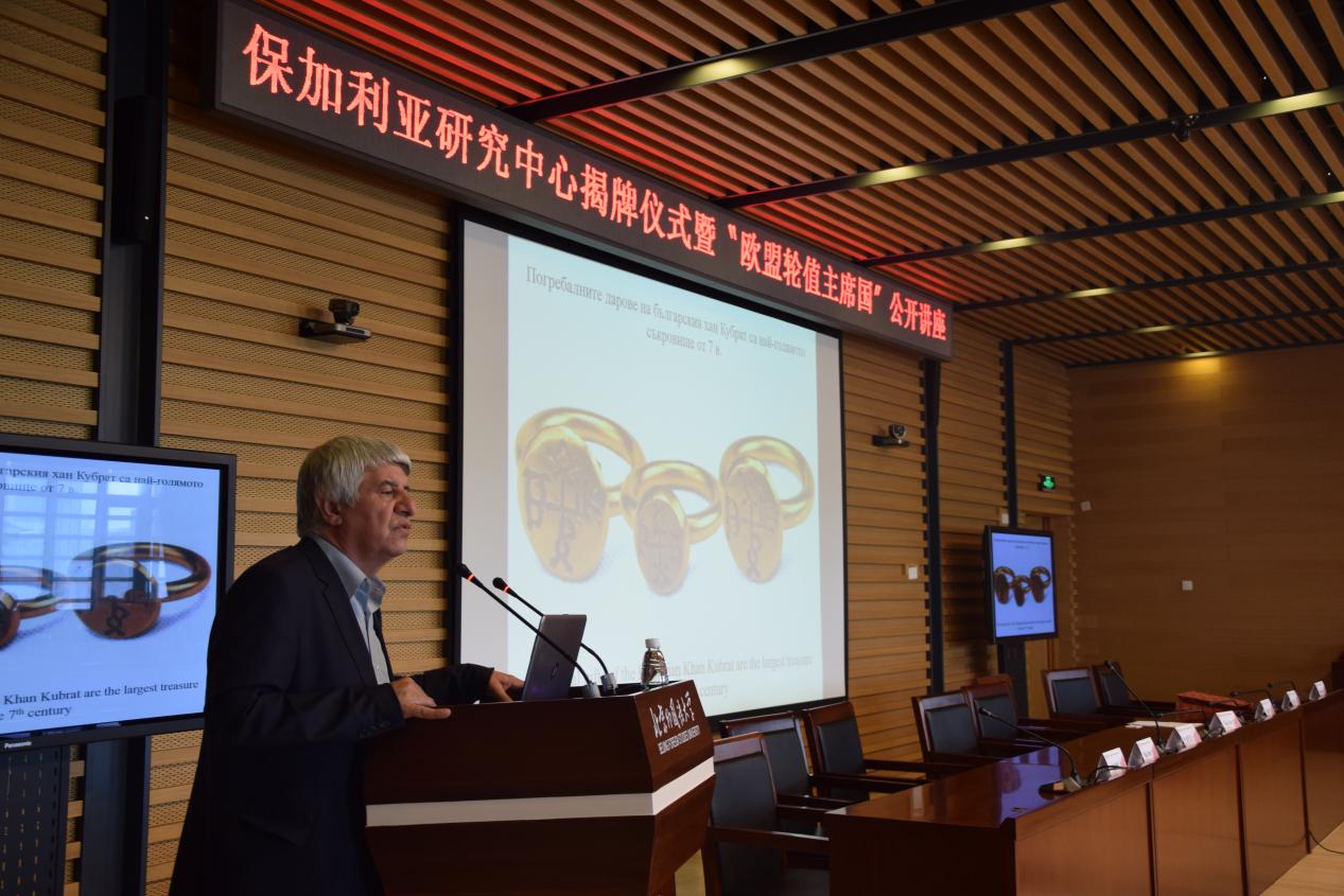 接下来,保加利亚科学院国家考古研究所的历史教授Nikolai Ovcharov就“‘保加利亚’使命”主题发表演讲。他结合自己团队的考古工作,向师生们展示了保加利亚的丰富历史文物以及最新的考古发现——当今世界上唯一一座献给希腊神话人物俄尔普斯的神庙。