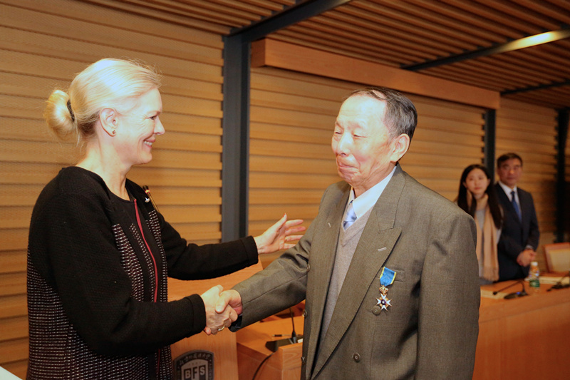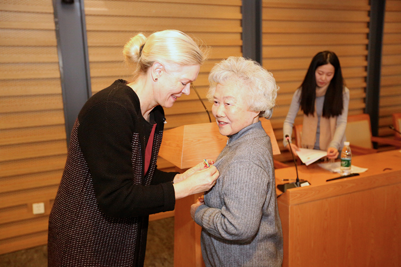瑞典驻华大使馆文化参赞马福力(Mathias Lafolie)、国际交流与合作处处长柯静出席授勋仪式,欧洲语言文化学院副院长董希骁主持仪式。杨迟、石琴娥两位教授的亲属、老同事、老学生一同见证了这一光荣时刻。