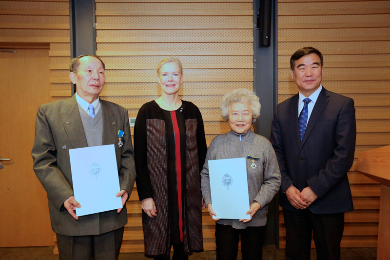 授勋仪式上,林戴安大使将北极星勋章挂到两位教授胸前,并向他们颁发了由瑞典国王卡尔十六世·古斯塔夫亲笔签名的证书。瑞典语班学生演唱圣诞歌曲,向两位前辈表示祝贺。
