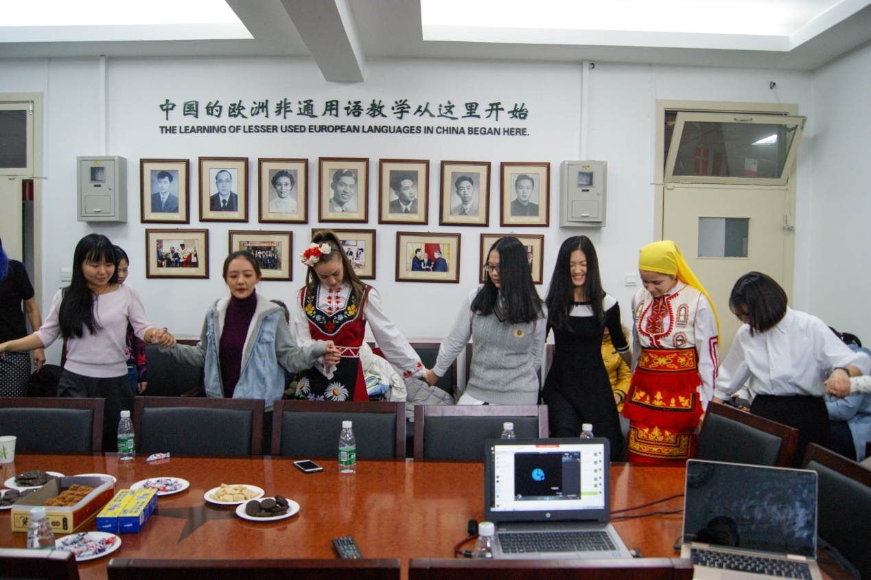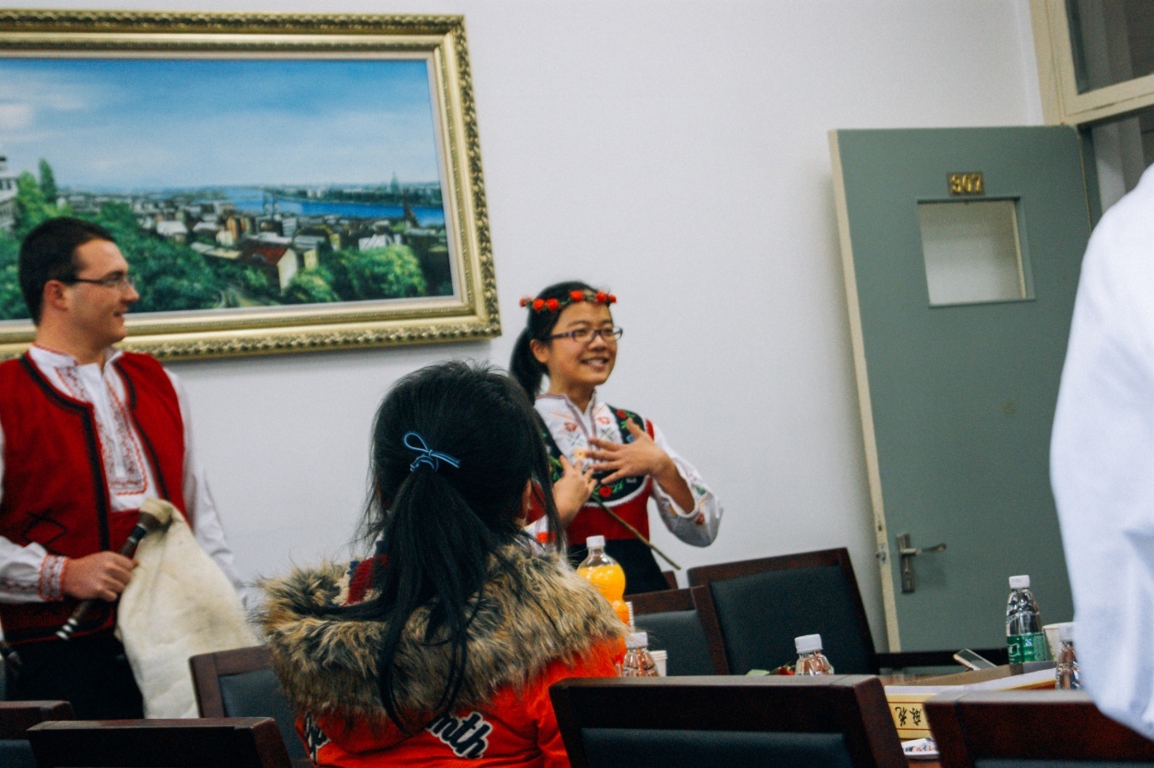 当三位乐队成员身着红白相间的民族服装走入联欢会场地时,同样穿着精美的保加利亚服饰的2014级保语学生林宇翔唱起了欢快的《一支保加利亚玫瑰》,来表达对客人的欢迎。