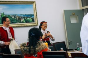 接着,同学们演唱了保加利亚歌曲《我的美丽森林》和《高高的蓝蓝的山》,优美的旋律中蕴含着同学们对于保加利亚语的热爱,令保加利亚客人动容。为了展示中华文化的博大精深,2017级的陈悦同学和郑赫雯同学分别表演了中文歌曲《红豆》和太极拳,让客人感受到了丰富的中国文化。
