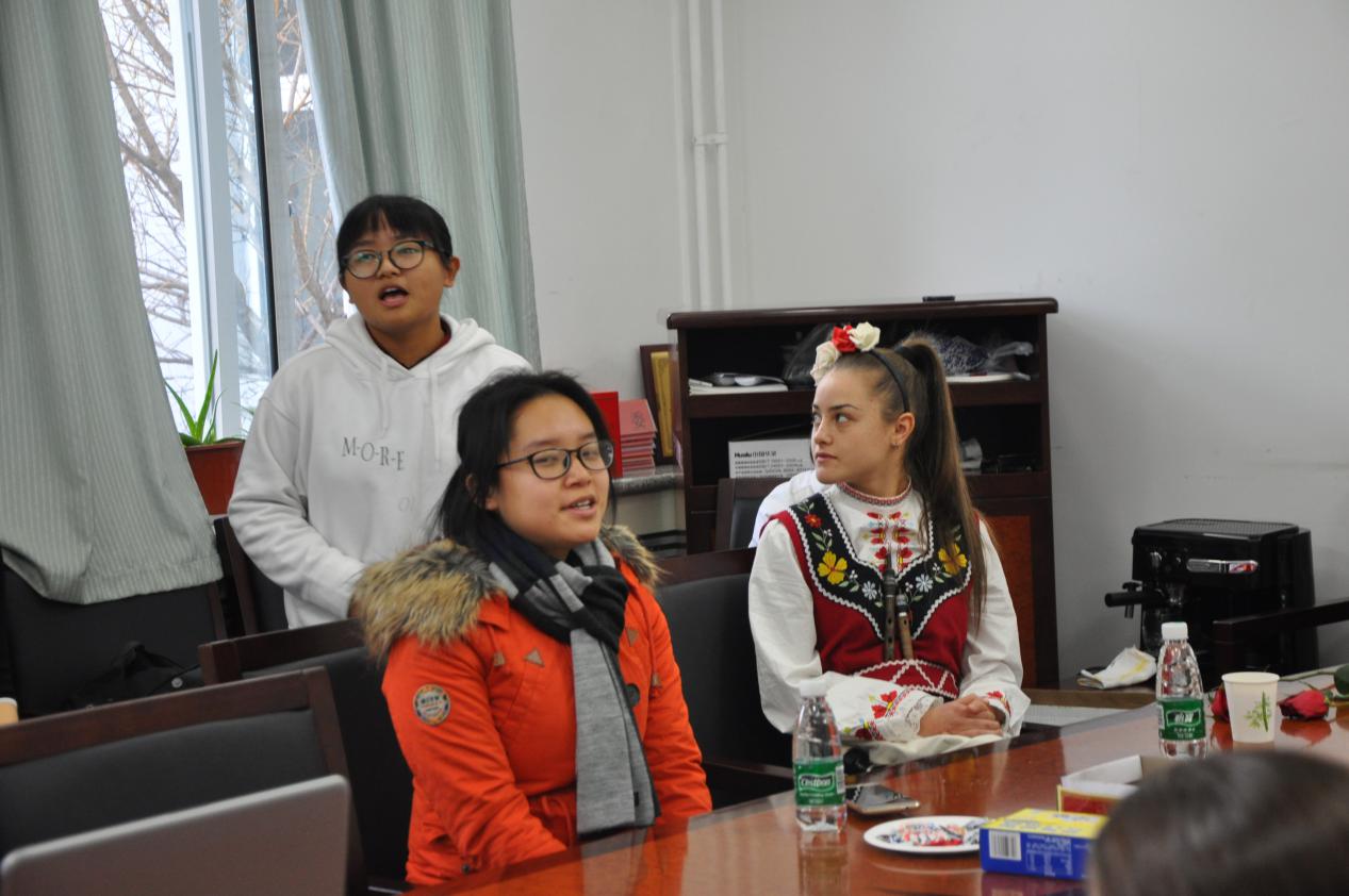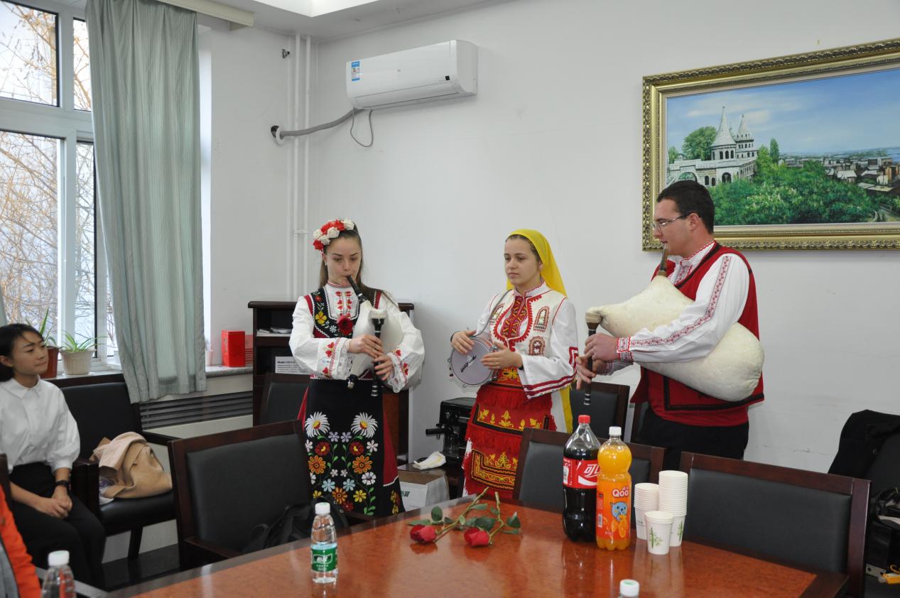 在主持人周春梅致欢迎辞后,乐队为了回应同学们的热情,用保加利亚民族乐器羊皮笛演奏了当地民歌。欢快的音乐声感染下,大家不禁跟着拍子拍手应和,沉浸在保加利亚风情之中。