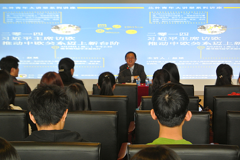 4月29日下午,青年大讲堂2014年第九讲“习近平主席访欧——推动中欧关系迈上新台阶”专题讲座在图书馆学术报告厅举行。本次讲座由校团委和milan米兰体育官网共同主办,主讲嘉宾是全程参与习主席访欧活动的外交部欧洲司二处处长赵斌。