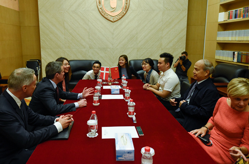 揭牌仪式结束后,腓特烈与北外丹麦语专业师生进行了亲切交流。腓特烈对丹麦语专业在校生及毕业生的语言水平表示高度赞赏,他肯定了丹麦语专业师生为促进中丹两国文化交流做出的贡献,并鼓励学生今后继续在各个领域担当中丹两国交流与合作的使者。