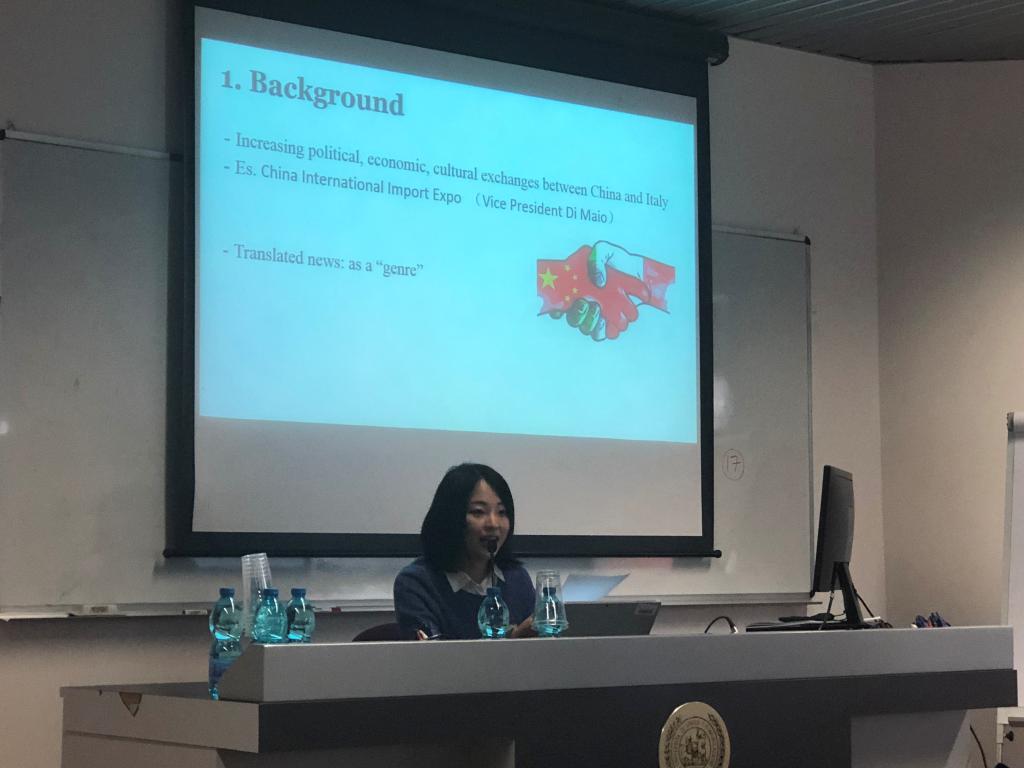 余丹妮博士在会上进行了发言,题目为Cross-cultural knowledge dissemination in media discourse: Analysis of Italian-Chinese/Chinese-Italian Parallel Newspaper Corpora,基于意汉/汉意双语双向新闻平行语料库,分析了中意媒体新闻翻译的体裁类型及翻译策略,对中意媒体知识传播策略异同进行了探讨。