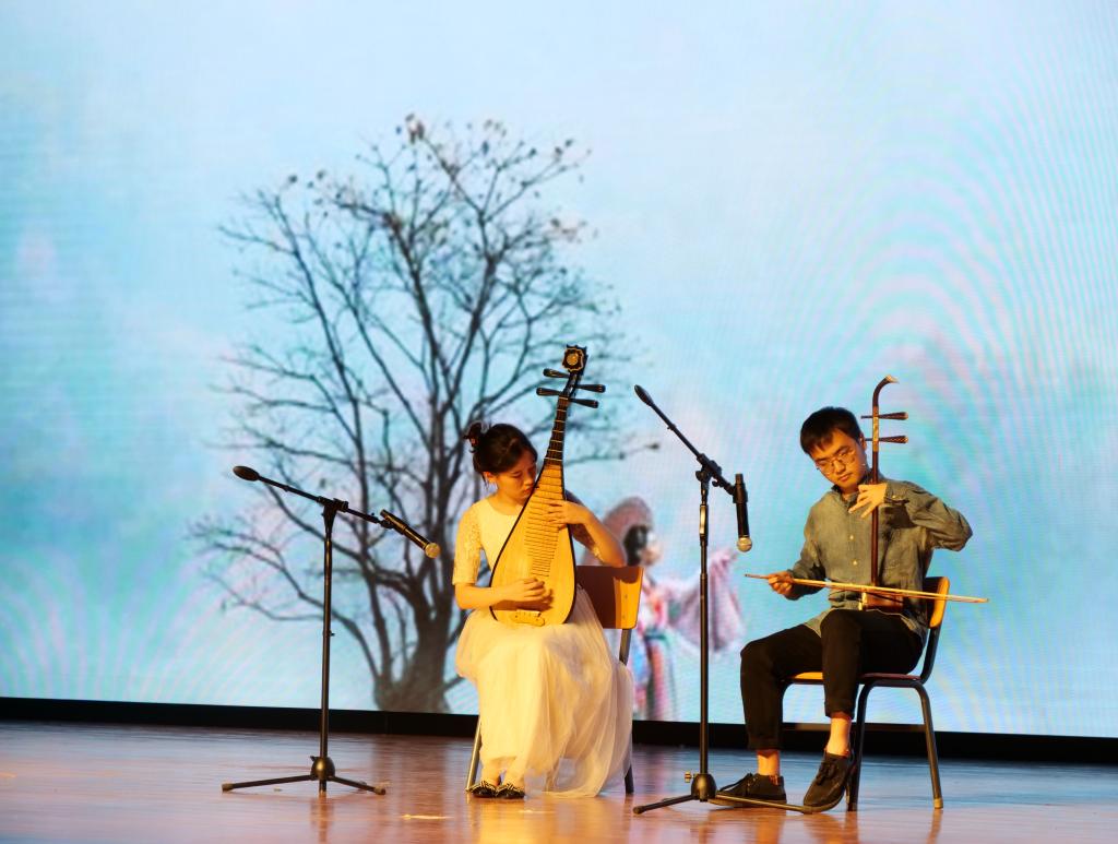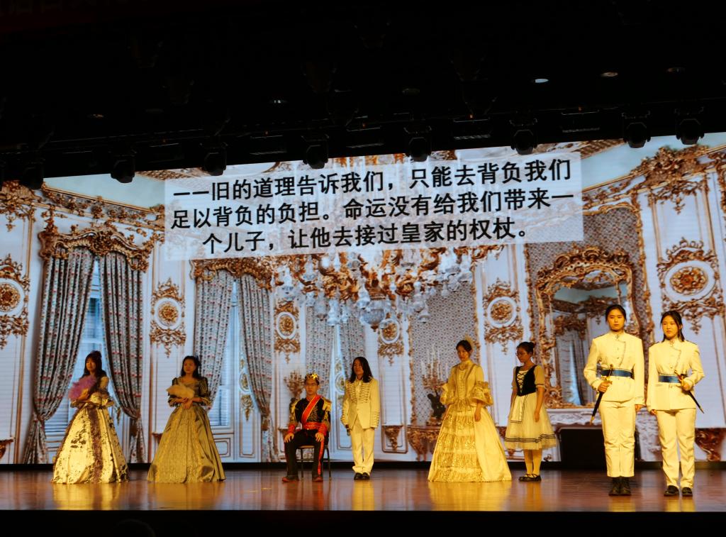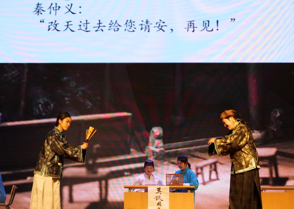 罗马尼亚语班改编并出演的老舍剧作《茶馆》第一幕登场。熟悉的京腔京韵以异国他乡的语言为载体,演绎出清末正阳门外裕泰茶馆人来人往“莫谈国是”的社会图景,余韵悠长。