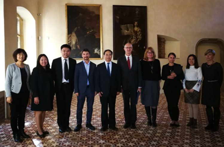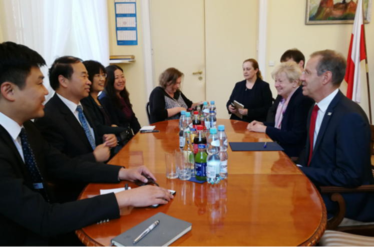 王定华一行访问波兰华沙大学,与该校校长马尔钦•帕维斯、副校长约兰塔•霍因斯卡-米卡以及华沙大学汉学家们进行了会谈,就进一步深化学术合作、扩大人员交往等事宜进行了深入交流,并就双方联合培养高级翻译硕士项目进行了深入研讨。