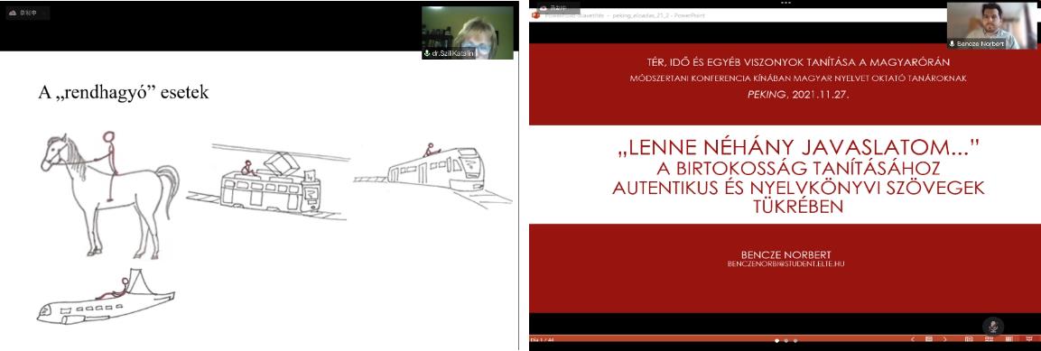 在为期两天的会议中,来自匈牙利罗兰大学的两位专家为与会教师做了三场在线讲座。讲座内容大大丰富了教师们的知识储备,为教学工作提供了极有价值的帮助。来自匈牙利罗兰大学的西丽·考陶琳(dr. Szili Katalin)教授为参会老师准备了题为《图表在匈牙利语“空间”和“时间”表达教学中的使用》、《有意义和“无意义”的动词前缀教学》两场讲座;来自匈牙利罗兰大学的班采·诺尔贝尔特(Bencze Norbert)博士为大家带来了以《真实语料和教材中的所属格教学》为题的精彩讲座。两位专家为参会教师进行了深入的理论知识讲解和切实的教学实践指导,并与参会者在线上积极互动,回答教师们提出的各类问题。教师们学习热情高涨,纷纷反应收获满满。