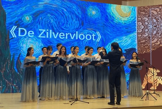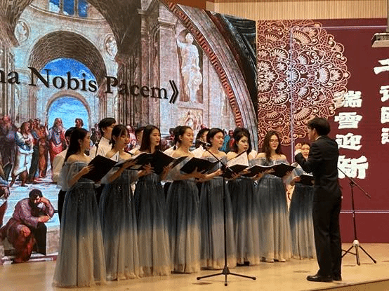 “心神无俗累,歌咏有新声”。接着是欧洲语言文化学院合唱团为大家带来的多曲目合唱《De Zilvervloot》《茉莉花》《De Tempestate》《Dona Nobis Pacem》,气息绵远、共鸣和谐,协调一致、富于变化,牵动着观众的情感。中国民谣的清新、外国歌曲的典雅在合唱中展现的淋漓尽致。观众们沉浸在声部起伏中,如闻空谷兰香,回味良久。