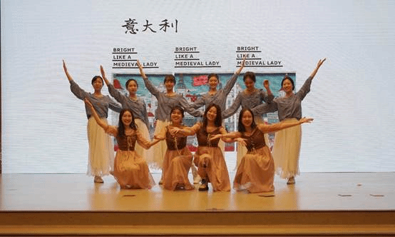 异国小调中,欧舞的队员们踏着欢快跳脱的拉脱维亚舞步向我们走来。从波罗的海的风光到地中海沿岸的意大利。他们在旋转跳跃中变换着舞姿。节奏明快又热情奔放。他们用异域舞蹈展现出欧洲大陆的风土人情。