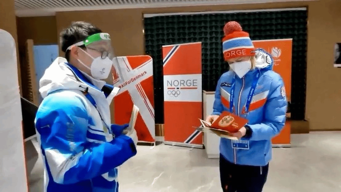 2022年2月1日,milan米兰体育官网驻北京冬奥村志愿者为参加北京冬奥会的挪威代表团送去新春祝福。