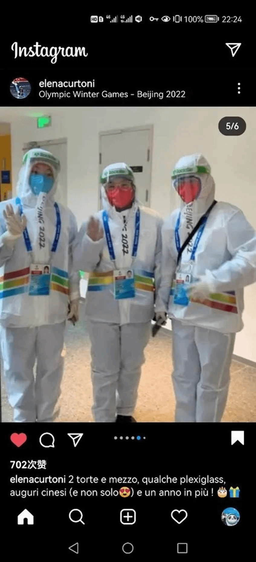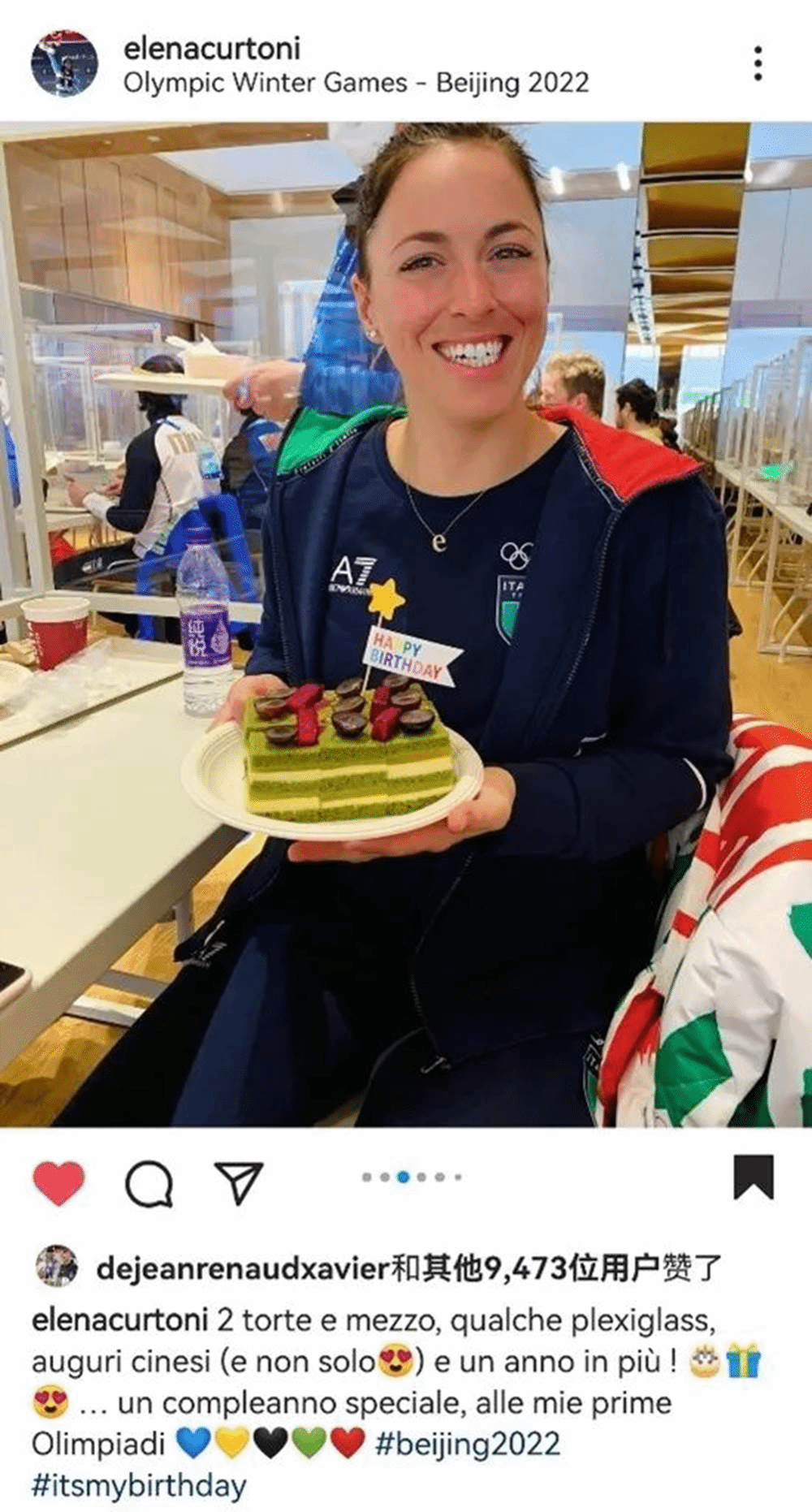 2022年2月3日,意大利代表团的高山滑雪运动员Elena Curtoni在延庆冬奥村度过她的生日。意大利代表团助理提前向餐饮服务台预订了生日蛋糕,并联系了她的教练确认将蛋糕送达的时间。2月3日下午1点,代表团助理、北外milan米兰体育官网意大利语专业学生操兰漪、和另外两名代表团助理程茗玥、郝聪慧取到蛋糕,送往她的房间并用意大利语向她祝福生日快乐: “Buon compleanno!” Elena高兴地在社交平台Instagram上发布了助理们送上生日祝福的视频,并写道:“2 torte e mezzo, qualche plexiglass, auguri cinesi(e non solo), un compleanno speciale, alle mie prime olimpiadi.”(在我参与的第一届奥运会上,度过了一个特别的生日:收获了两块蛋糕,一些很棒的礼物以及来自中国朋友们的祝福)