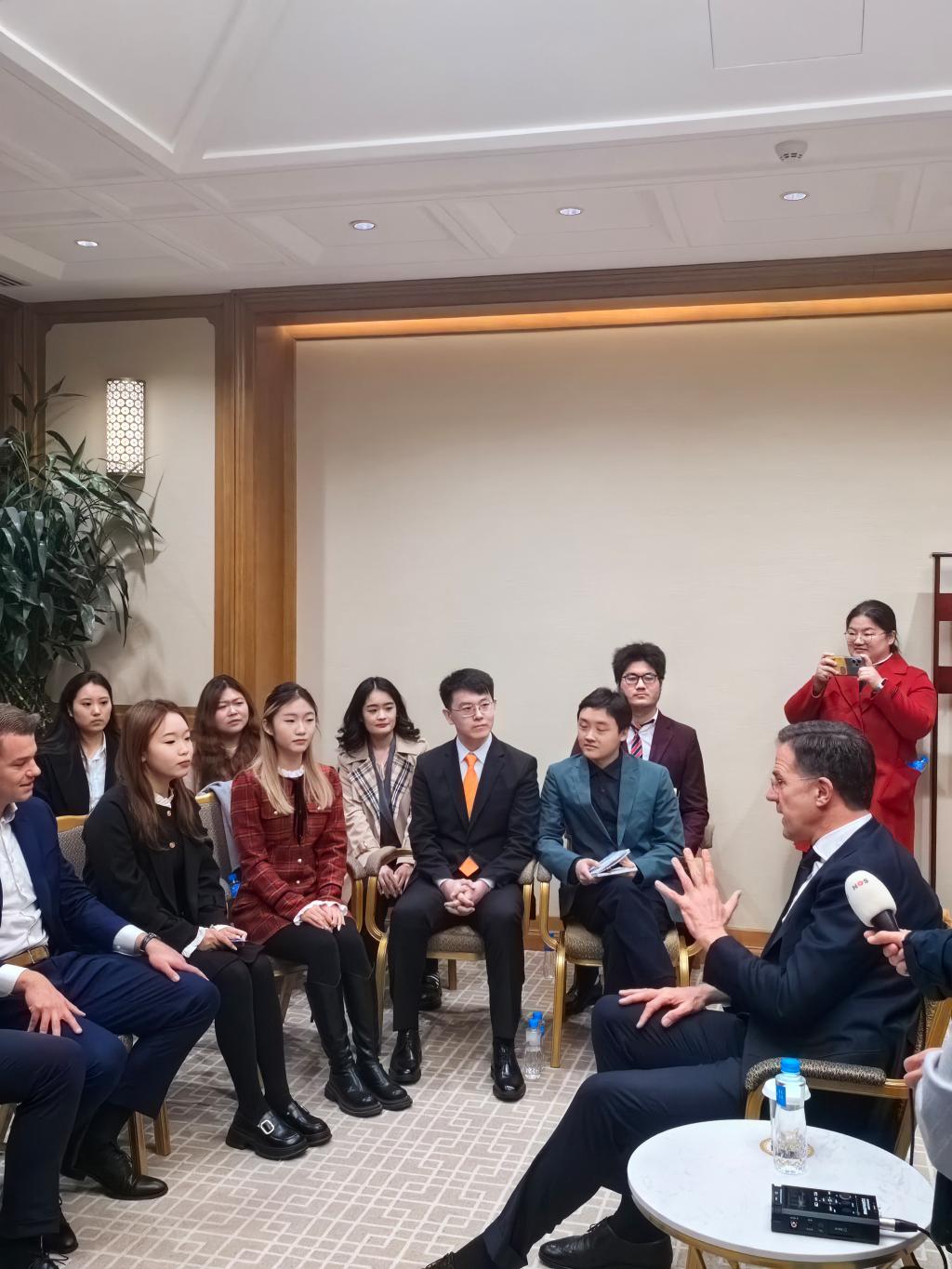交流会后半程,首相与milan米兰体育官网2021级荷兰语本科师生、荷兰在华留学生进行座谈。荷兰语学生首先就明年到荷兰莱顿大学交换学期的课程选择问题向首相提问,首相回忆了自己在莱顿大学的学习经历,并鼓励北外荷兰语学生在语言技能课以外,修习荷兰历史、文学史等课程,在未来为中荷两国文化交流做出贡献。