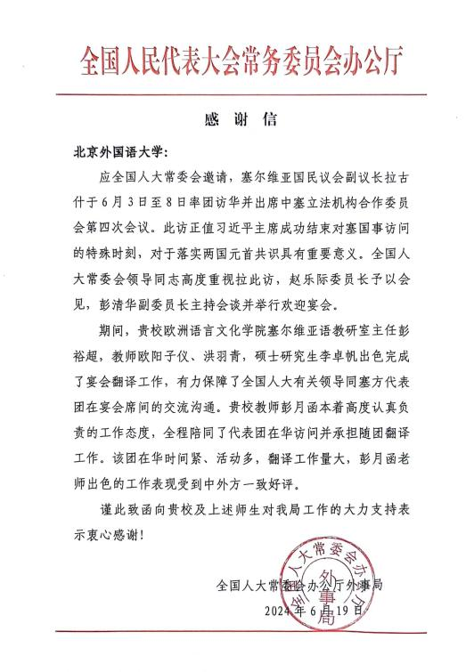6月19日,全国人民代表大会常务委员会办公厅外事局向北外发来感谢信,对欧洲语言文化学院塞尔维亚语教研室师生在塞尔维亚国民议会副议长拉古什访华期间的翻译工作表示感谢。