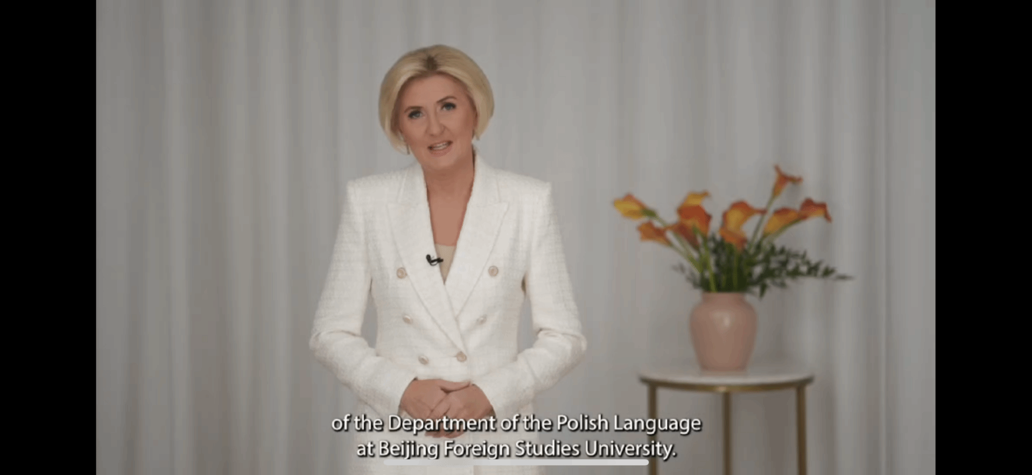 波兰共和国总统夫人阿加塔·柯恩豪瑟-杜达(Agata Kornhauser-Duda)发来祝贺视频。她指出,北外波兰语专业在人才培养和文化交流方面的工作,对促进国际理解和中波友谊十分重要,希望未来波兰与中国在教育、文化等领域继续深化合作。