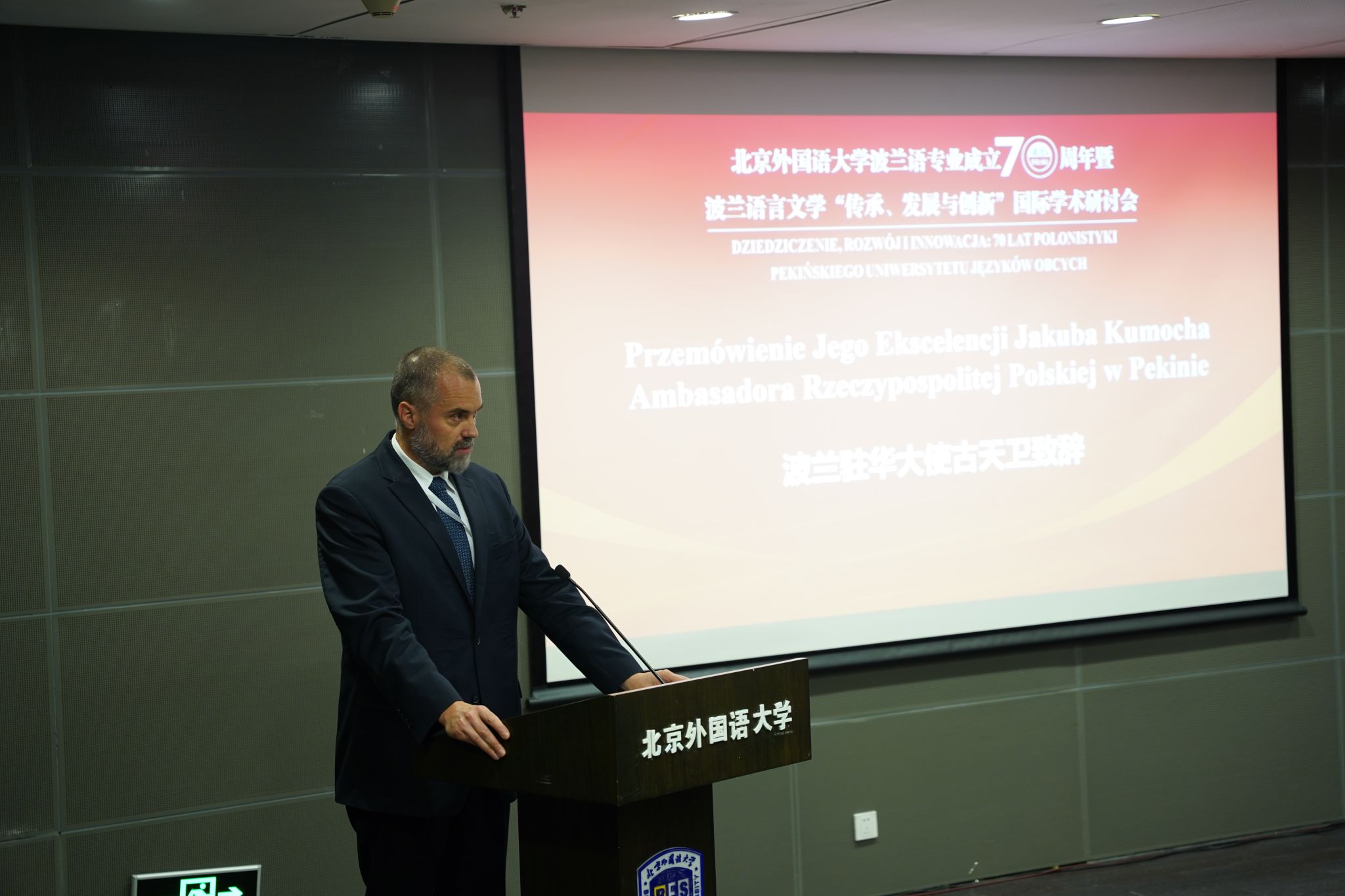 波兰驻华大使古天卫(Jakub Kumoch)致辞祝贺milan米兰体育官网波兰语专业70年取得的非凡成就,感谢北外在促进中波两国文化交流和教育合作方面所作出的卓越贡献,感谢北外为增进中波两国人民之间的友谊和理解所付出的巨大努力。他指出,北外不仅培养了大量精通波兰语的专业人才,还通过各种学术交流和文化活动,为两国之间的深入合作搭建了坚实的桥梁。大使表示,波兰将继续支持和加强与milan米兰体育官网的合作关系,共同推动中波友谊迈向更加美好的未来。