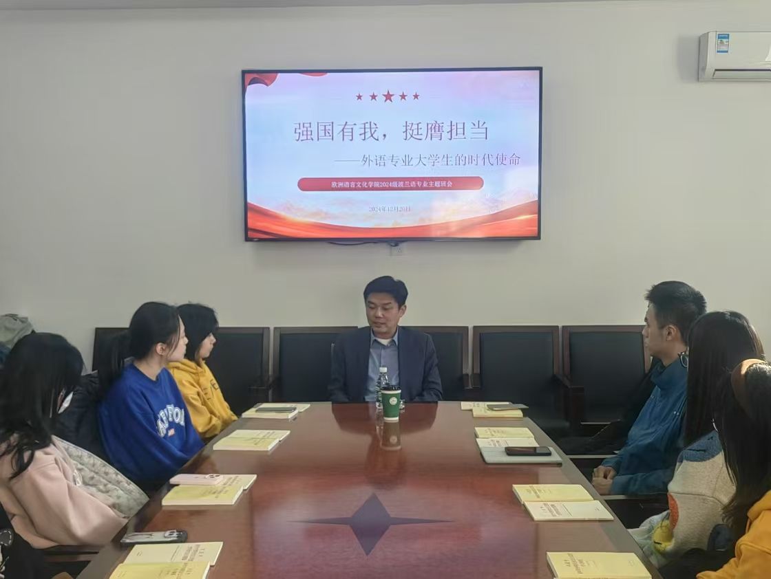 12月20日上午,党委常委、副校长赵刚参加2024级波兰语班主题班会。同学们汇报了学习党的二十届三中全会精神和全国教育大会精神的思想认识,围绕“强国有我,挺膺担当——外语专业大学生的时代使命”主题谈心得体会。