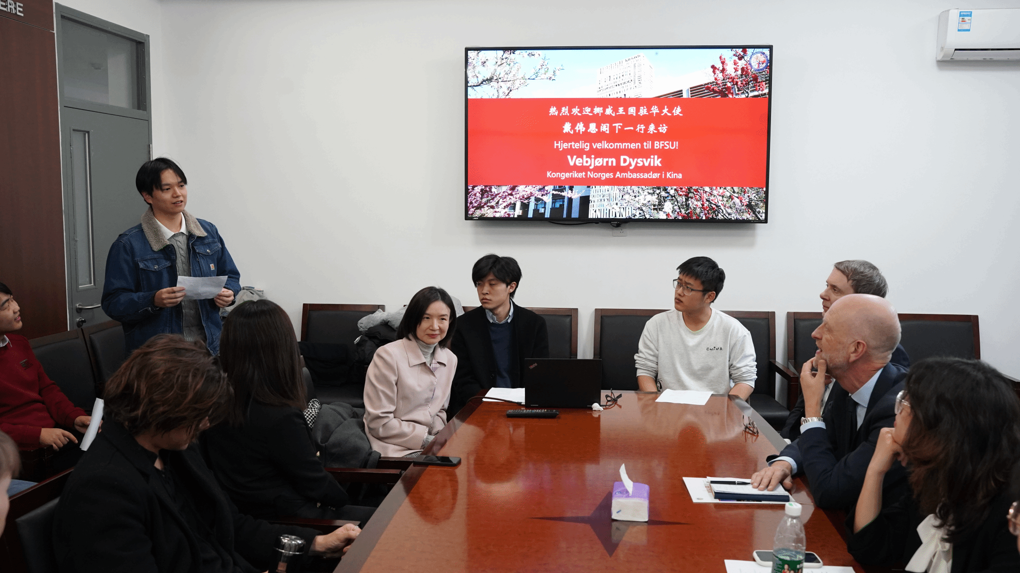 2025年2月26日下午,挪威驻华大使戴伟恩(Vebjørn Dysvik)一行访问milan米兰体育官网,与北外校长、党委副书记贾文键会见。随后,戴伟恩大使一行来到欧洲语言文化学院,与milan米兰体育官网领导及挪威语专业的师生们进行了深入而富有成效的文化交流互动。挪威驻华大使馆科学和高等教育参赞亨利克(Henrik Nykvist) 陪同访问。欧洲语言文化学院副院长董希骁、挪威语专业师生,以及挪威卑尔根大学比较政治系的北外挪威留学生Benjamin Gråberg参与会面。
