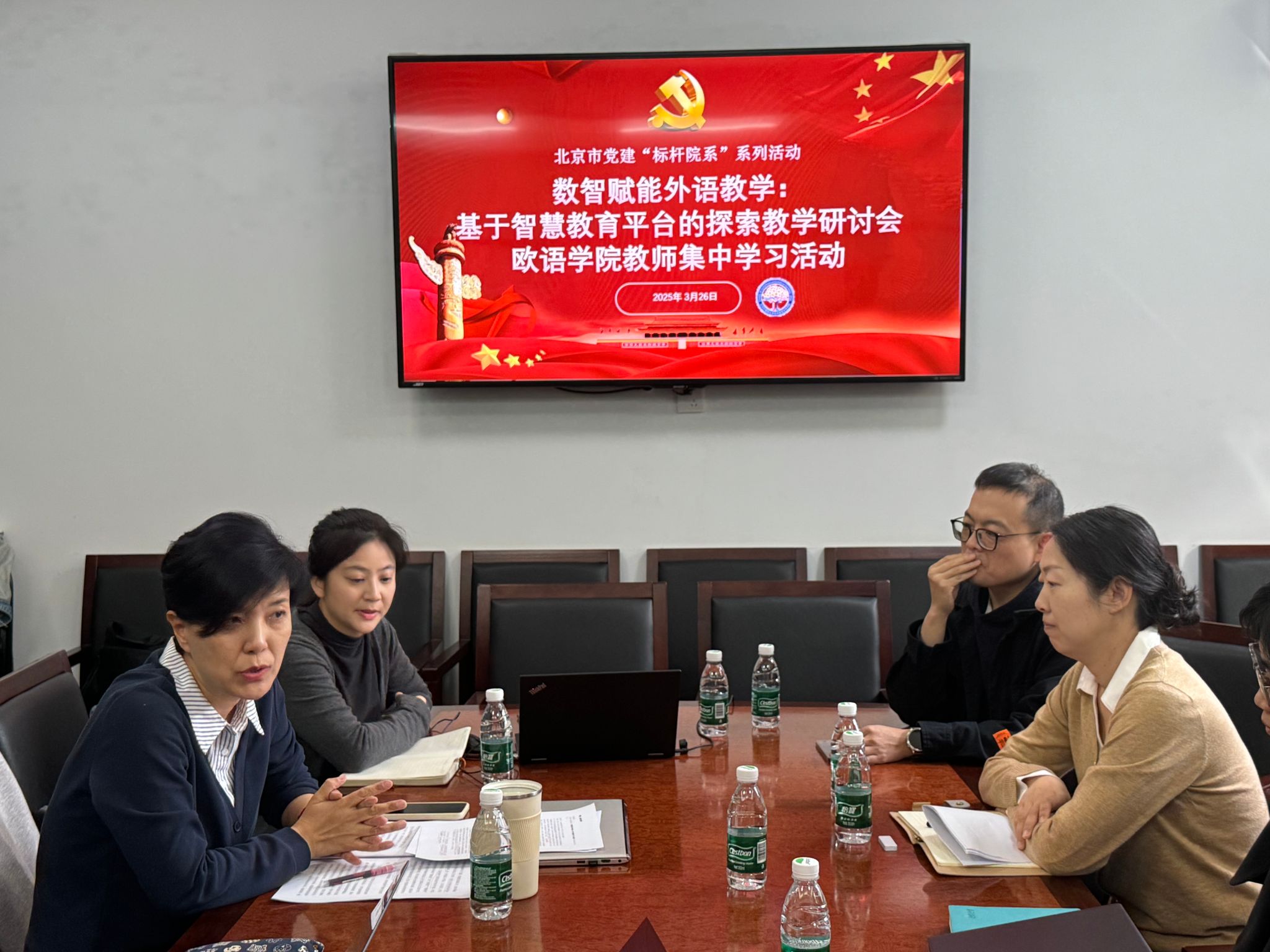 林温霜紧扣全国两会精神和中央八项规定精神,围绕理论学习促进外语教育教学和技术创新谈学习心得。于芳结合党建理论与教学实践,系统阐释了智慧教育平台的建构逻辑,展示了数字技术如何优化课程设计、提升互动效率,为外语教育数字化转型提供了新思路。超星集团与智慧树平台的技术专家从技术实操层面展开培训,演示了语言学习资源库建设、AI辅助教学、学情数据分析等功能及其应用场景,解答了教师关于平台落地的具体问题。