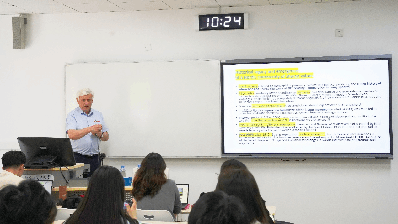 在互动环节中,库恩勒教授与现场师生就北欧国家与中国之间的合作前景进行了深入讨论。他指出,随着全球性挑战的增加,北欧国家与中国在应对气候变化、公共卫生安全等领域有着广阔的合作空间。他还提到,近年来中挪、中芬等北欧国家双边关系的不断发展,为北欧与中国之间的合作奠定了坚实基础。