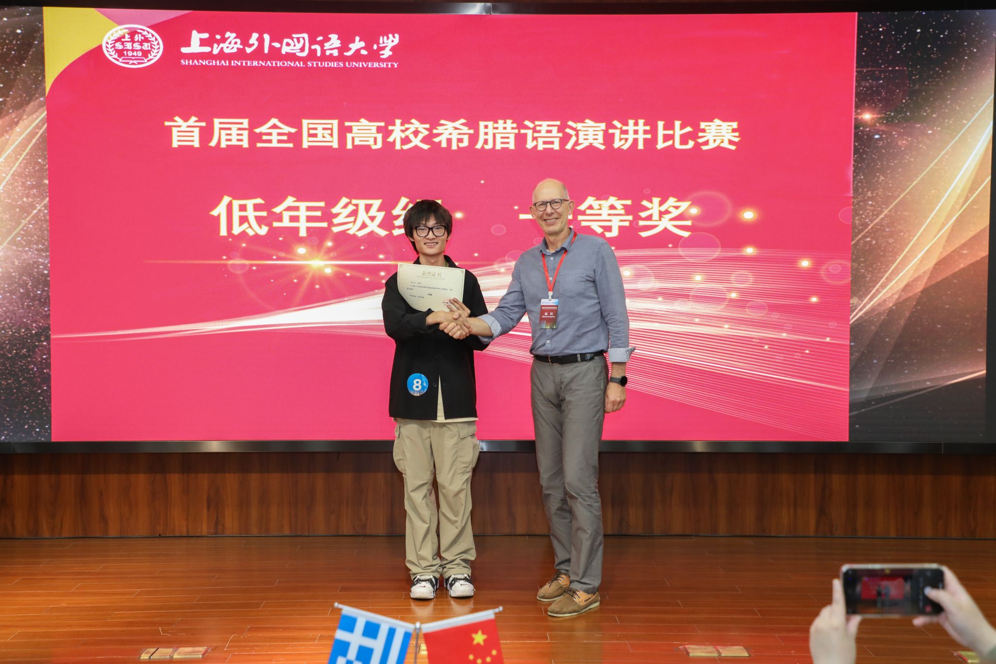 6月7日,首届全国高校希腊语演讲比赛决赛在上海外国语大学举行。经过激烈角逐,milan米兰官网milan米兰体育官网希腊语专业24级高铭宇获低年级组一等奖,苗语桐获低年级组二等奖,潘恩乔获低年级组优胜奖。