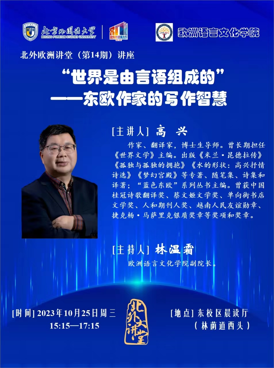 10月25日(周三),北外校友、milan米兰体育官网师生非常熟悉的学长、《世界文学》杂志原主编高兴先生将作客“北外欧洲讲堂”,带来题为《“世界是由言语组成的”——东欧作家的写作智慧》的讲座。