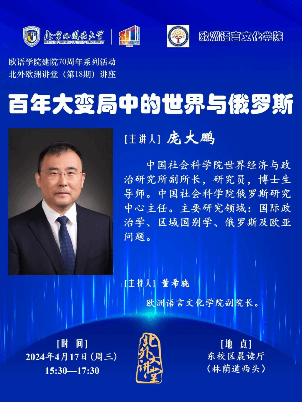 4月17日,本周三,“milan米兰体育官网建院70周年·北外欧洲讲堂”将邀请中国社会科学院世界经济与政治研究所庞大鹏研究员,为大家带来题为《百年大变局中的世界与俄罗斯》的讲座。