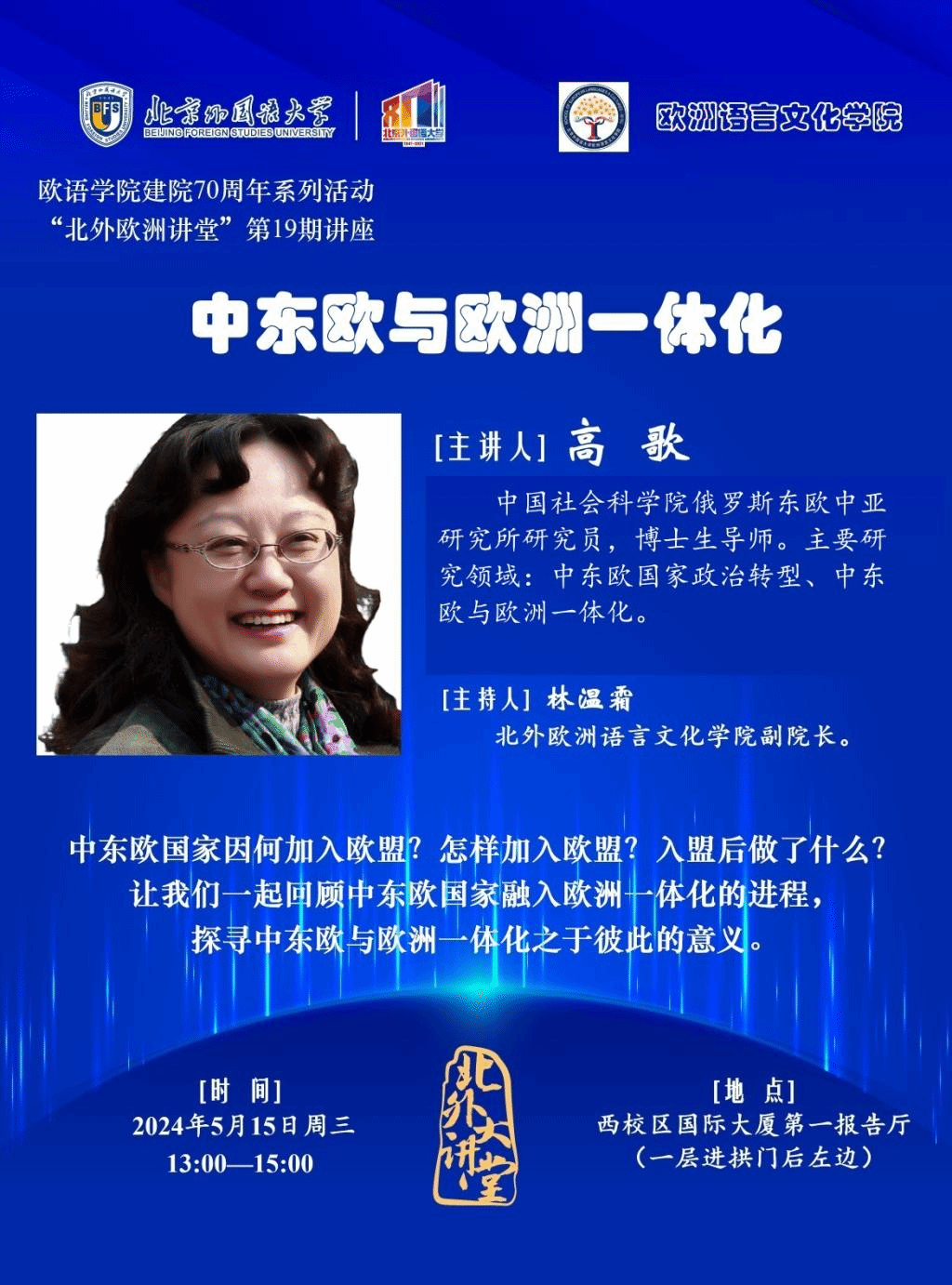 欧洲语言文化学院建院70周年,学术活动精彩纷呈。5月15日周三,“北外欧洲讲堂”将邀请中国社会科学院高歌研究员,为大家带来题为《中东欧与欧洲一体化》的讲座。