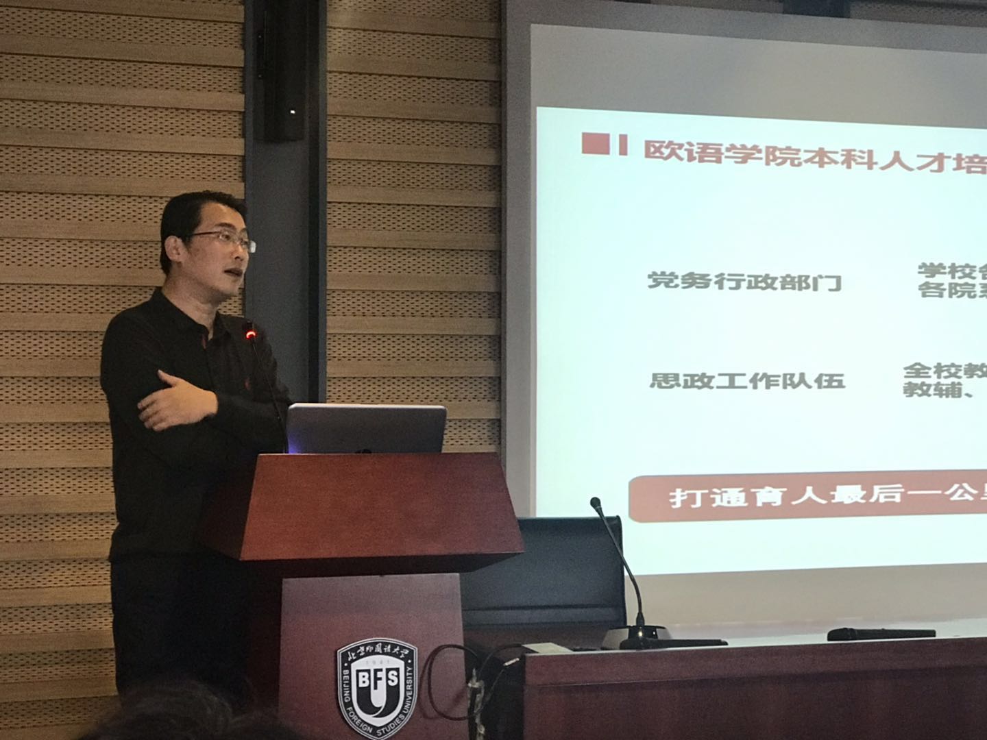 主旨发言环节,教务处处长李莉文作了题为“新时代北外人才培养理念、特色与保障”的发言,对北外本科人才培养的最新理念与措施进行了深度分析。milan米兰体育官网院长赵刚就近年来学院在复语、复合型人才培养方面的新理念和新举措进行了全面阐述。学生处处长丁浩作了“以人为本,精准施策,推进‘三全育人’综合改革”的发言,对milan米兰体育官网“三全育人”综合改革工作进行了具体指导。milan米兰体育官网党总支常务副书记杨文对milan米兰体育官网“三全育人”的工作任务进行了详细解读,并宣布学院“三全育人”综合改革工作正式启动。