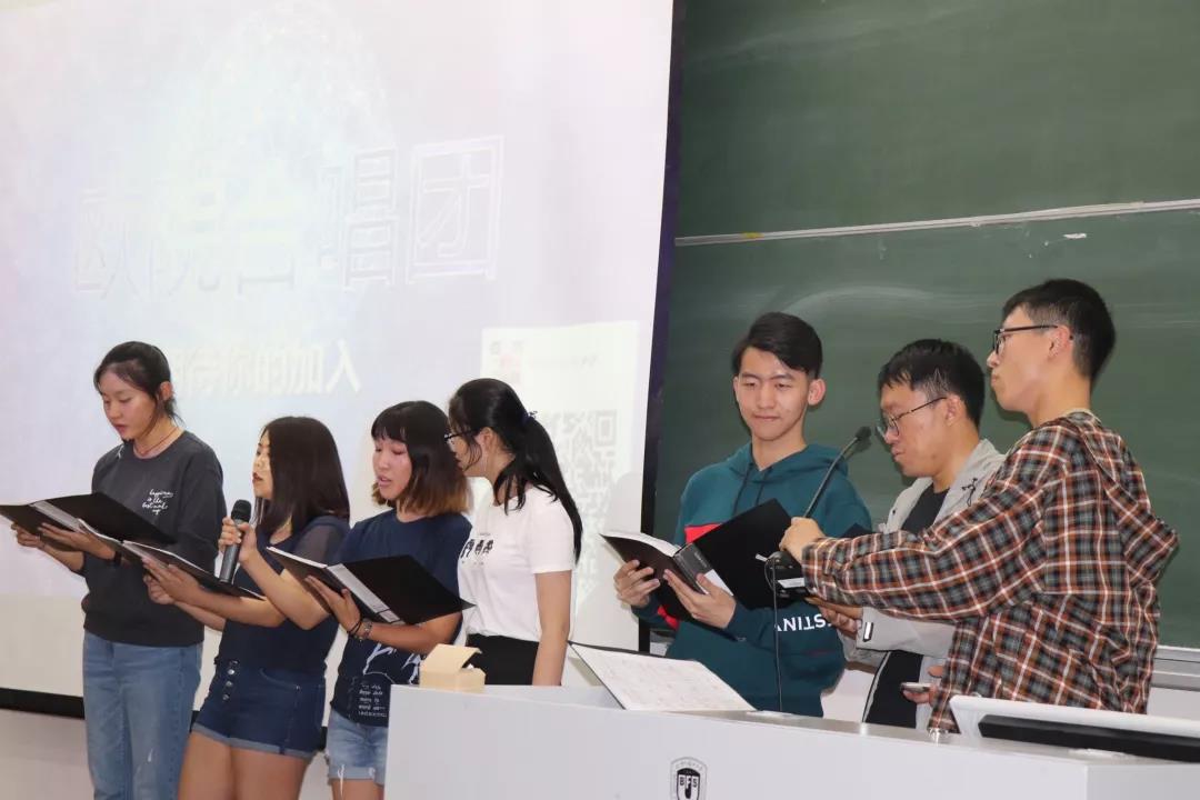 欧院团学联分为学生职能部门、艺术团两个部分。宣讲以生活部、体育部、媒体部、学习部、宣传部、文艺部、外联部、舞蹈队、合唱团、北斗、排球队、篮球队、乒乓球队、羽毛球队和足球队的顺序进行,中场休息的十分钟里还安排了艺术团表演。部长、团长们各自带来了精彩的宣讲,为新同学们展示了团学联的风采。