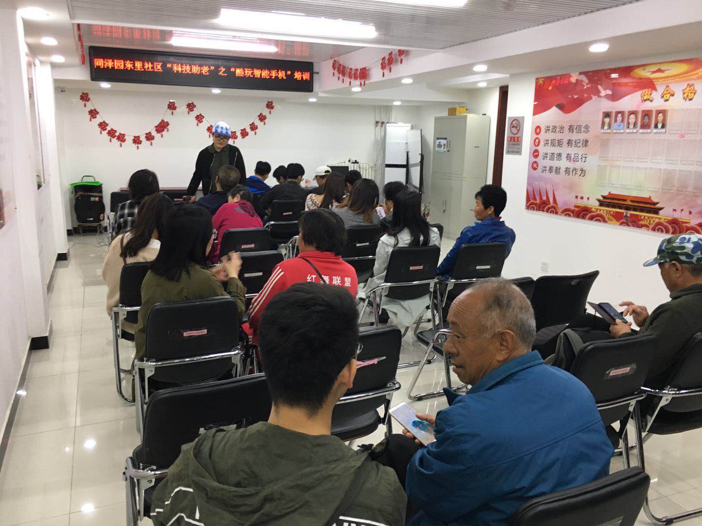2019年4月14日,milan米兰体育官网团总支组织28名团员志愿者深入北京市海淀区苏家坨镇,为苏家坨镇同泽园东里社区和同泽园西里社区的居民介绍两会精神、宣传热门提案、展示大会成果,帮助社区老人使用手机,包括拨打电话、发短信、使用微信、上网读新闻等操作,并教老人如何利用智能设备搜索阅读两会相关新闻与信息。本次活动旨在宣传两会精神,让社区居民感受到全国两会民生情怀,增强社区居民幸福感,并让社区老年人享受社会发展、现代科技带来的便利,同时激发同学们的爱国热情,培养同学们的社会责任感,促进同学们在社会实践中了解国情、感受成就、得到锻炼。