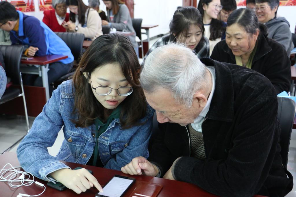 结束了“两会精神”宣传之后,最令老人们激动的环节到了。志愿者们开始一对一地为老人们提供“酷玩智能手机”培训,耐心地教老人们使用手机。一部手机,不仅缩短了时间、空间的距离,更填平了几代人之间的代沟。老人们最关心的问题就是微信的使用方法和如何用手机看新闻。使用微信,是为了和家人们沟通,听听他们的声音、看看他们的面容,即使是隔着屏幕,也能使老人们感到无限宽慰。看新闻是为了了解国家大事,老人们也都有一颗年轻且不愿落伍的心,他们曾是这个国家的栋梁、是这个国家最伟大的建设者,看着祖国日复一日更加繁荣昌盛,是令他们最骄傲和自豪的事情。看着老人们开心的笑容、感受到老人们好学的精神,志愿者们也深刻意识到关爱老人的重要性与肩负的社会责任。