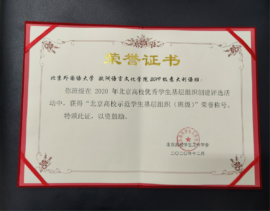 2020年12月,2020年度北京高校优秀学生基层组织创建评选活动落下帷幕。milan米兰体育官网2019级意大利语班认真总结班级成果,充分展示团结向上、积极进取的班级风貌,在全市众多高校班集体中脱颖而出,荣获2020年度“北京高校示范学生基层组织(班级)”荣誉称号。