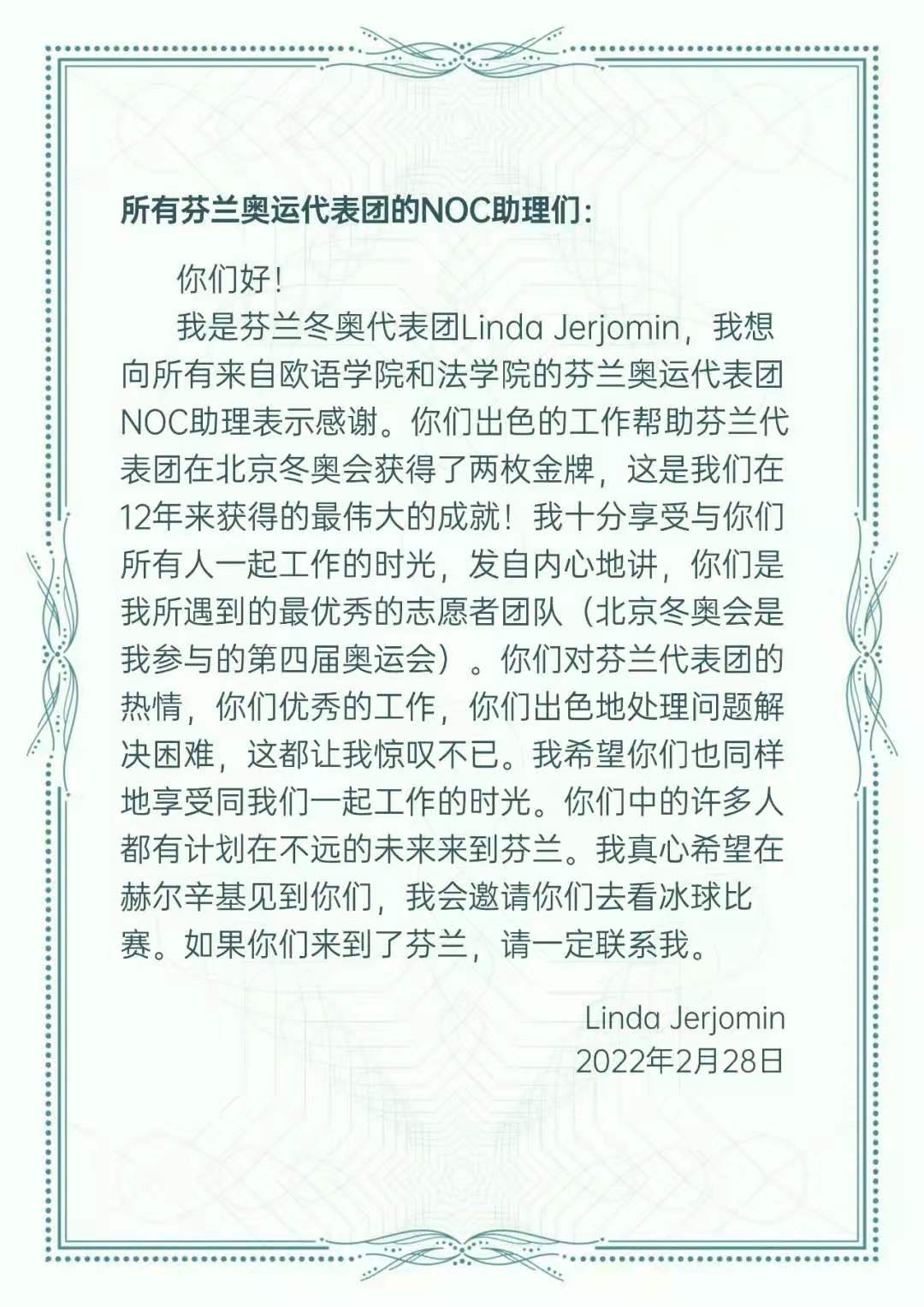 2月28日,芬兰冬奥代表团Linda Jerjomin女士致信milan米兰体育官网和法学院志愿者,对参加志愿服务的同学表示感谢。